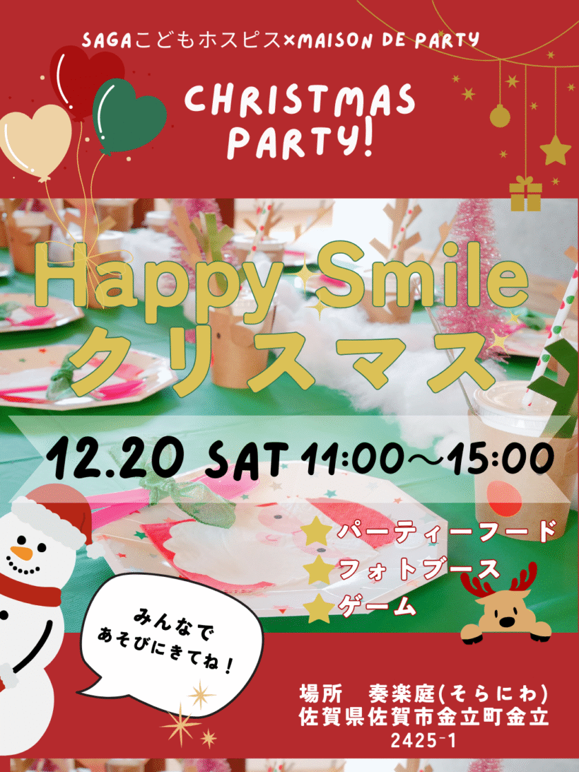 SAGAこどもホスピス×MAISON DE PARTY HAPPY SMILE クリスマスパーティー を開催します!🎅🎁💕